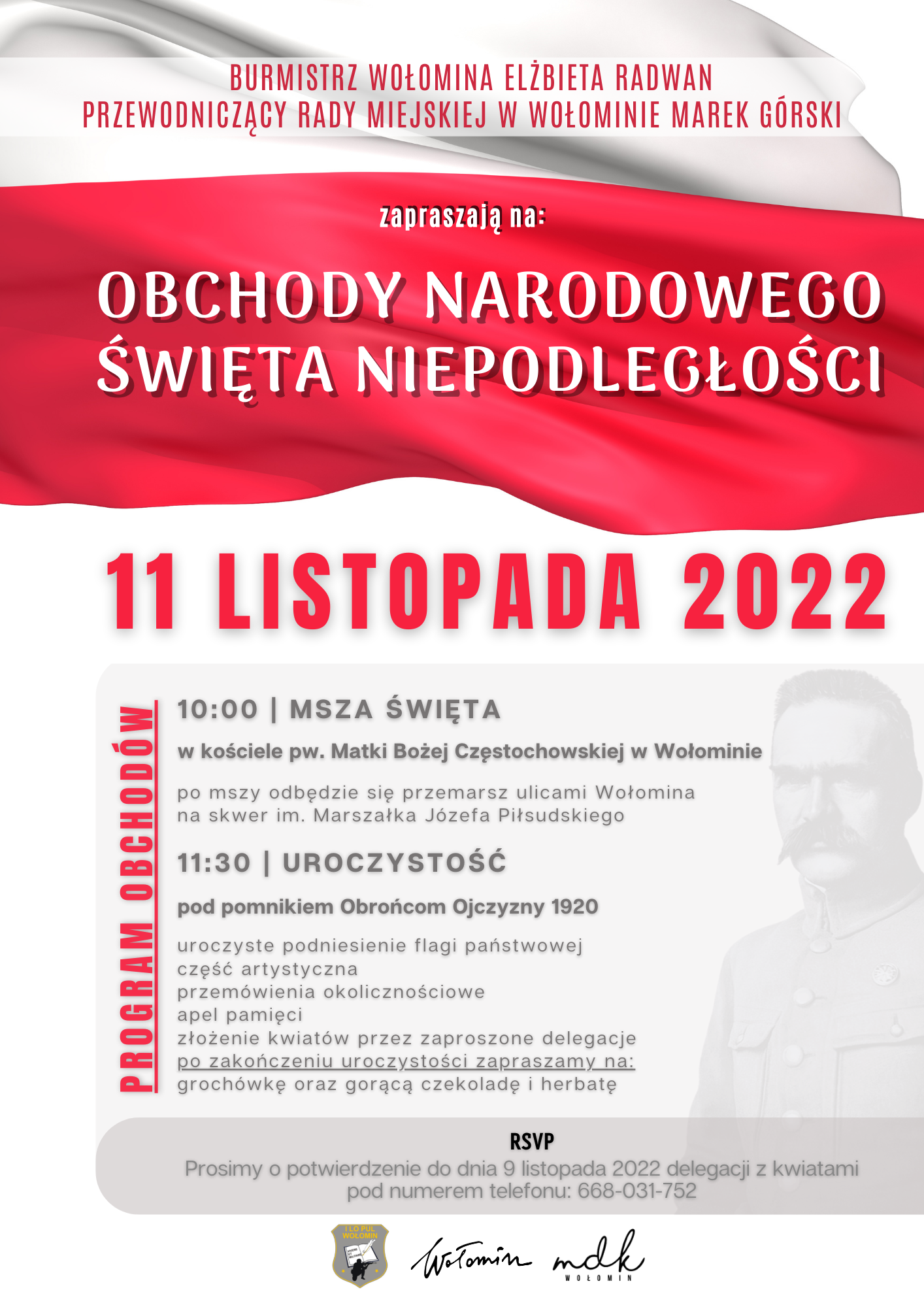 Elżbieta Radwan Burmistrz Wołomina oraz Przewodniczący Rady Miejskiej w Wołominie Marek Górski zapraszają na OBCHODY NARODOWEGO ŚWIĘTA NIEPODLEGŁOŚCI .