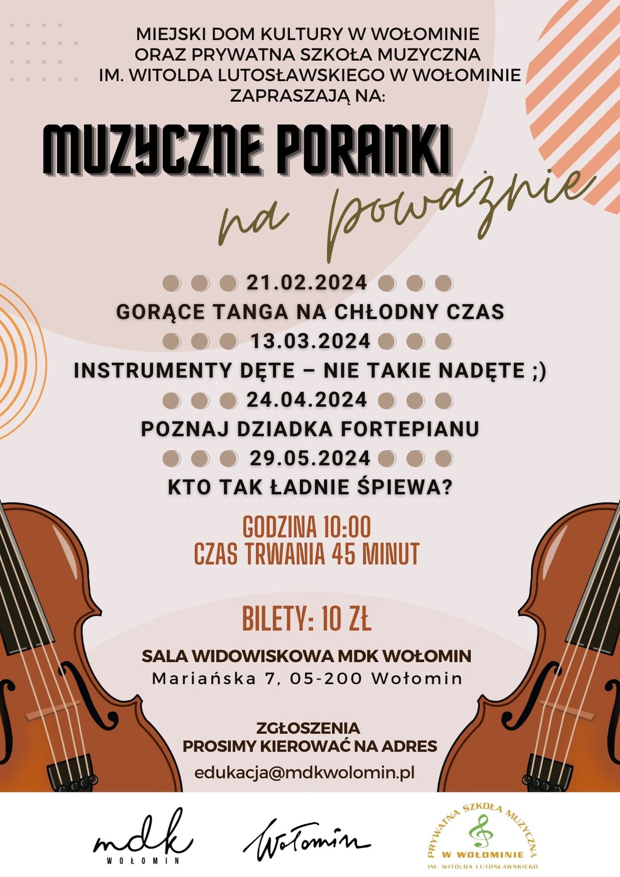 W lutym, po feryjnej przerwie wracają na afisz Muzyczne Poranki na Poważnie, organizowane razem z Prywatną Szkołą Muzyczną I i II stopnia w Wołominie.