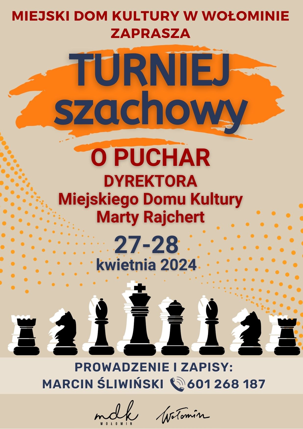 Wszystkich entuzjastów szachów, zapraszamy do udziału w TURNIEJU SZACHOWYM o puchar Dyrektora Miejskiego Domu Kultury w Wołominie Marty Rajchert.