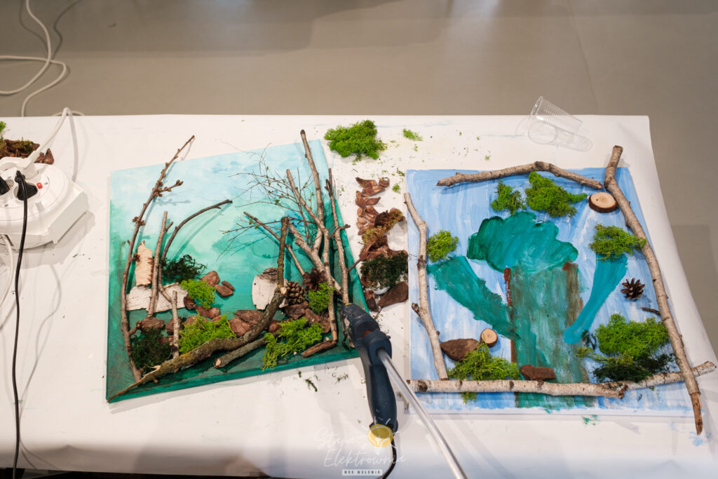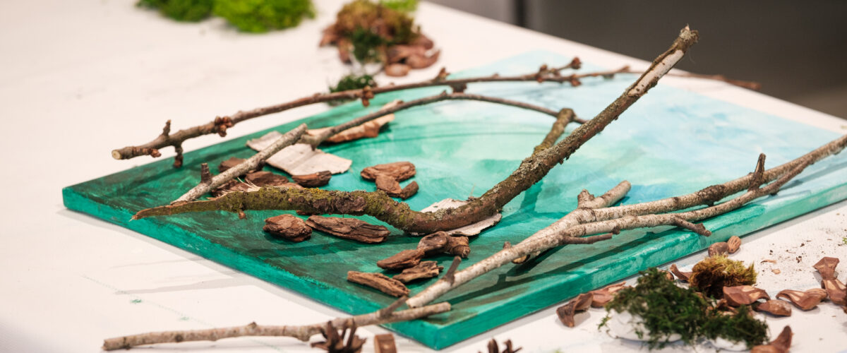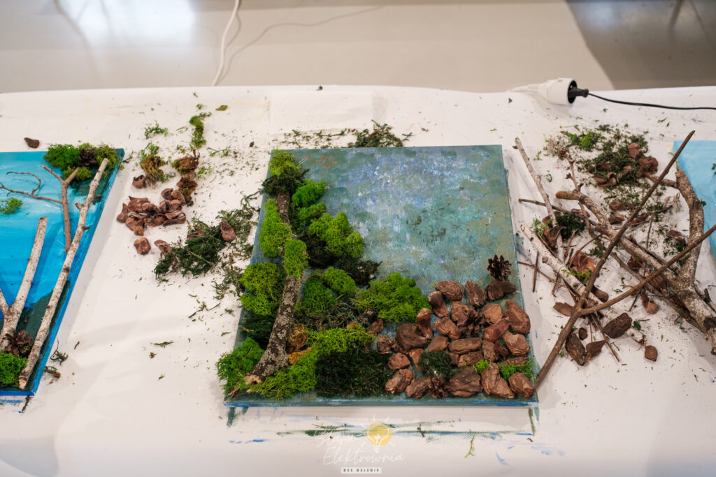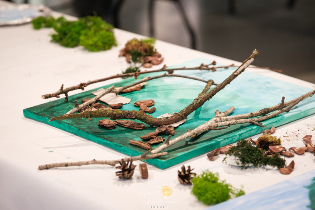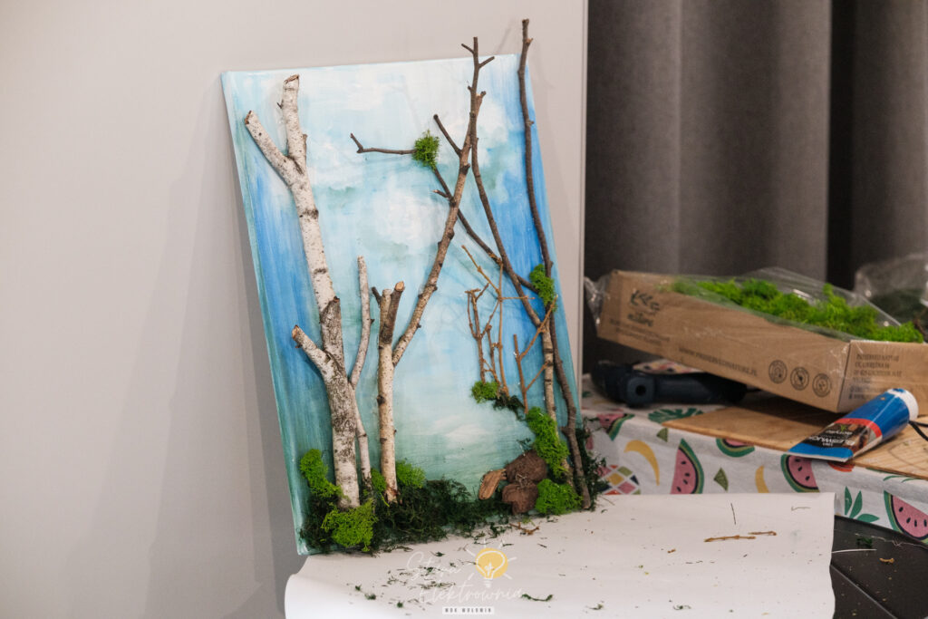 Następnie w ruch poszły dary lasu. Na blejtramach zagościły surowe gałęzie brzozy, płaty kory, polne kamienie czy miękki, zielony mech, który został na ten cel specjalnie zakupiony w sklepie florystycznym