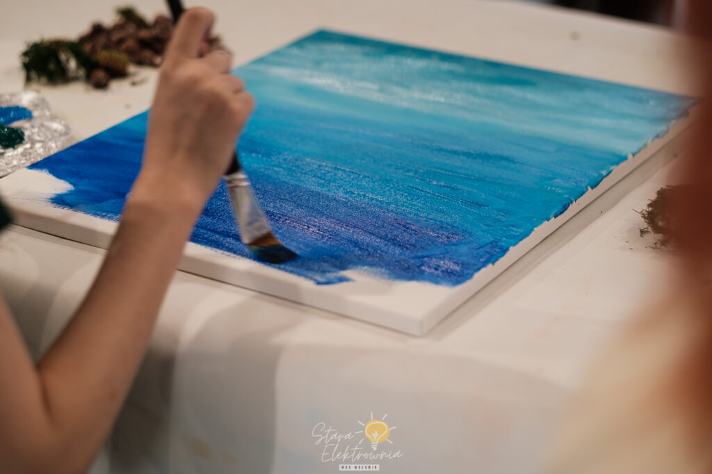 Zaczęliśmy od czystego płótna, nadając mu głębię za pomocą farb akrylowych. Powstały nastrojowe tła, będące idealną bazą pod nasze kompozycje.
